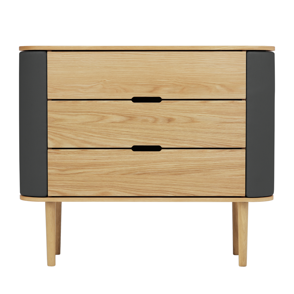 Solid oak and veneered particle board with clear coat wood finish, steel and polyester (Horizons S).